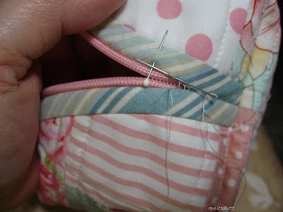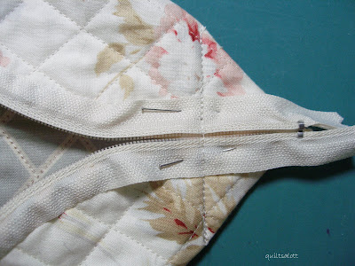 Pin one side of the zip to the bag from one pin to the other as in the photo. Hand sew the binding edge to the zip and repeat for the other side. You can click on these photos for close ups to see which way to orient the zip.