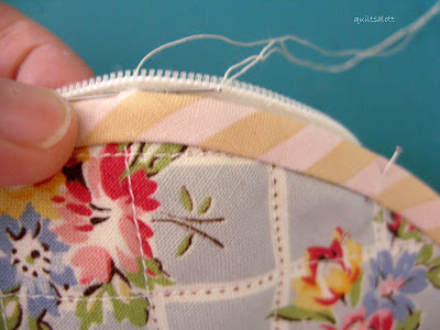 Turn the bag right side out and stich the binding edges together up to where the zip has been stitched previously to the binding. Do the same on both sides.
